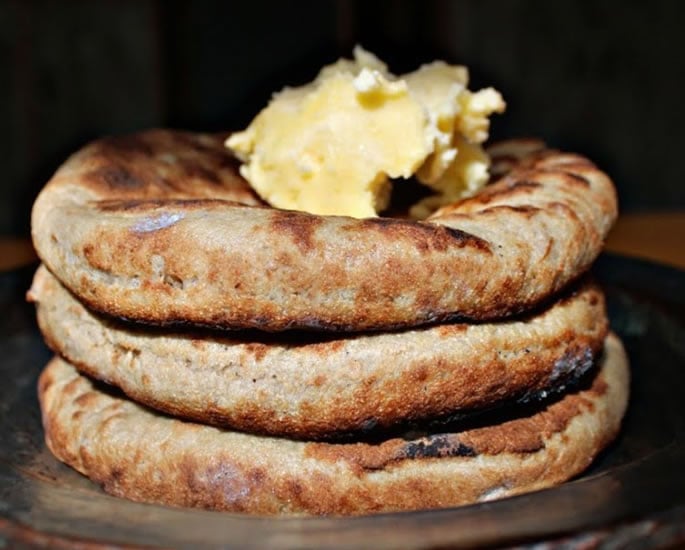It cooks on a hot tawa until the edges crack and release a nutty aroma. The surface develops a light char, while the inside stays dense and grain-forward.
