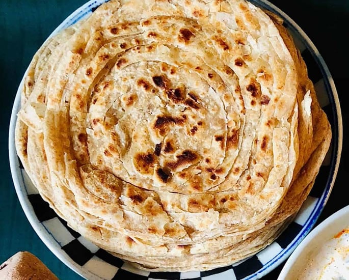 Paratha is a layered, unleavened flatbread cooked on a griddle with ghee or oil.