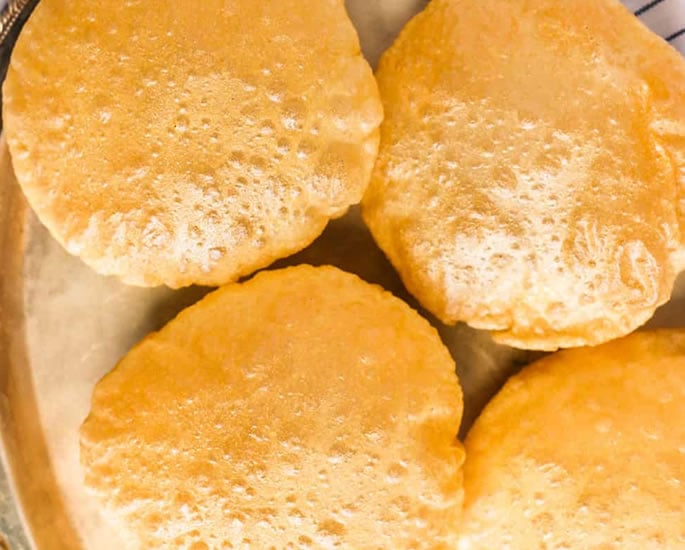 Luchi is a refined flour bread that puffs quickly when dropped into hot oil. It forms a thin, pale disc with a soft interior and lightly blistered surface.