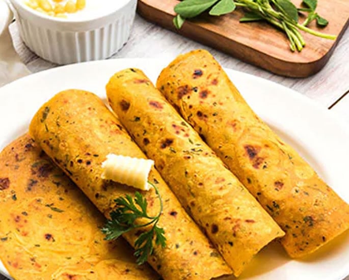 Thepla is a Gujarati flatbread designed for travel and long shelf life. It stays fresh for days, making it a practical choice for journeys and packed meals.