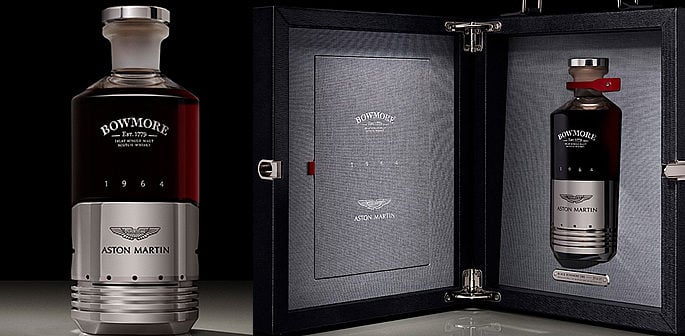 It takes Bowmore’s reserve Black 1964 single malt whiskey and packages the deep obsidian black nectar with Aston Martin’s iconic DB5, which is from the same era.