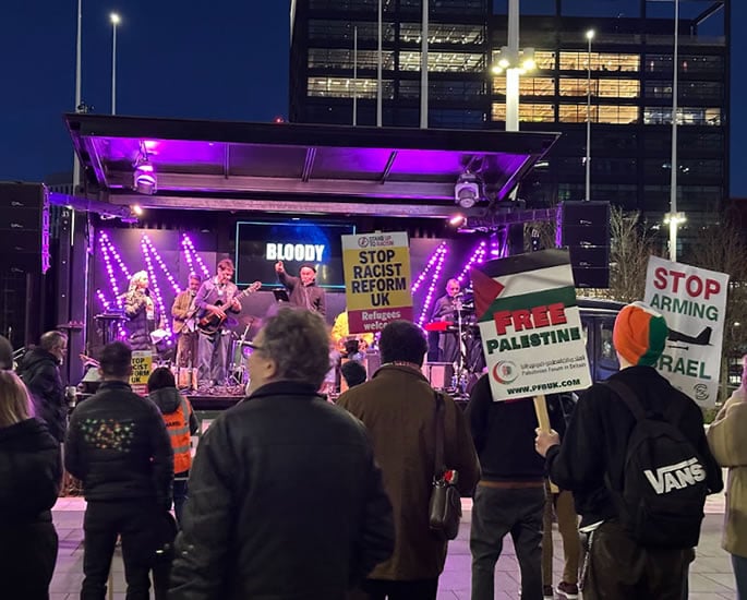 Organised by groups such as Stand Up to Racism and Socialist Worker, hundreds stood outside the Utilita Arena, where Farage appeared in front of his own crowd of 10,000.
