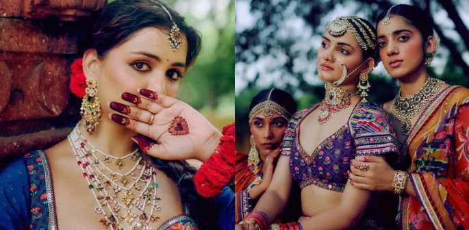 Embellishments fuse traditional and modern techniques, combining hand embroidery with digital printing, gota and dori work with contemporary ghungroos, and zardozi with sequins and mirrors.