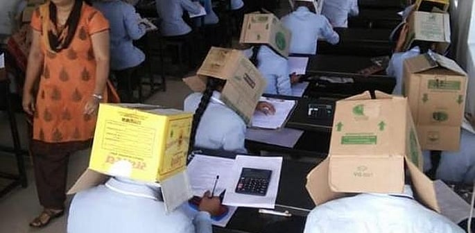 “A notice has been issued to Bhagat Pre-University College seeking an explanation for forcing its students to wear cardboard boxes while writing exams to prevent them from copying [from each other].”