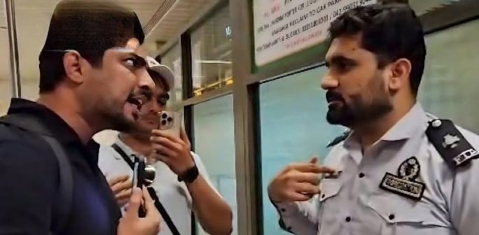 The footage captured at Lahore Airport shows the journalist engaging in a very heated confrontation with a staff member.