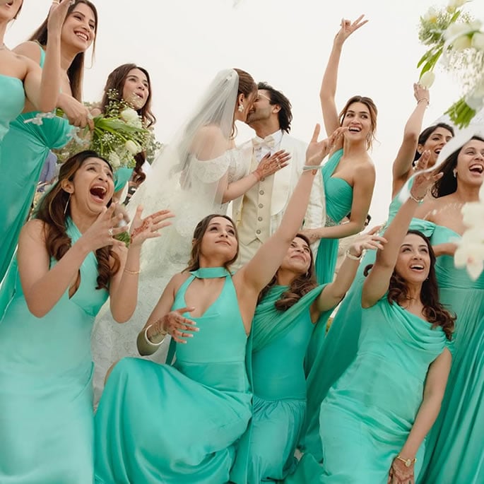 Bridesmaids, including Kriti, wore sea green dresses, while the bride’s parents were also dressed in white.