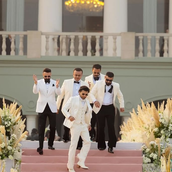 The sangeet ceremony featured a lavish pink backdrop and energetic dance performances by family members and close friends.