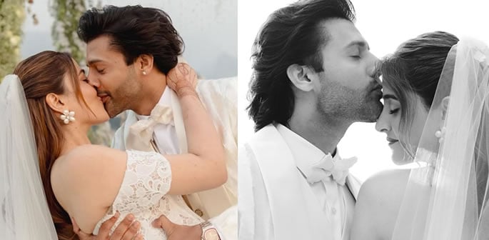 Nupur wore an off-shoulder lace gown with a veil, with her mehendi visible on her hands. Stebin opted for a coordinated white ensemble.