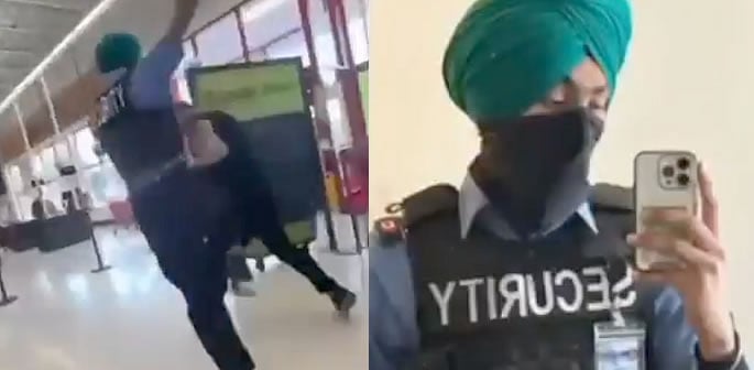 The clip began with the man throwing punches at the turban-wearing security guard.