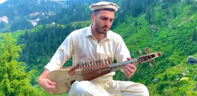 The video opens to show the rabab player sitting with his instrument against a picturesque background.