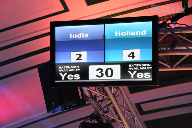 Whilst the earlier games in the finals were played in a quieter mood, the entry of the Indian team was an ecstatic one which filled and resonated the room with the sound of Indian dhols and pyrotechnics going off to add sparkle to the event.