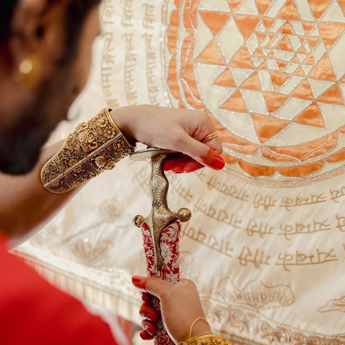 Rashmika arrived at the mandap on an ivory palki adorned with intricately carved motifs while Vijay carried a long brass sword sheathed in an embroidered red case.