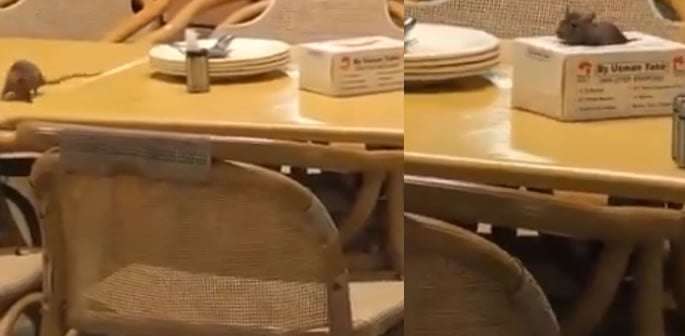It reveals rodents moving freely across tables, plates, and even inside a tissue box placed on a customer table.