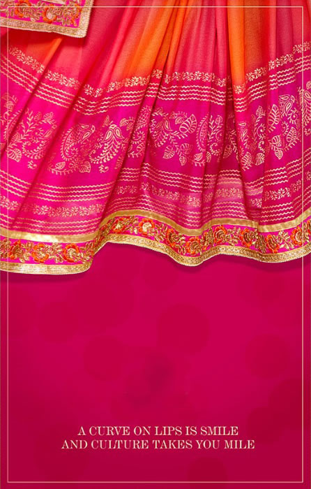 Mixing again traditional hues of pink, orange and red in a block colour effect, the pallu features a gold border with a scalloped hemline.
