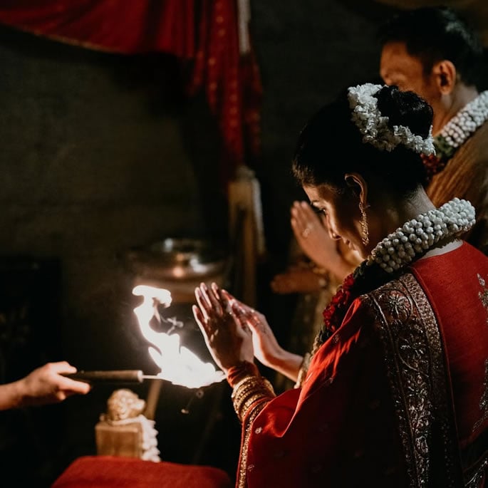 It begins with Raj placing a large ring on Samantha’s finger inside the temple.