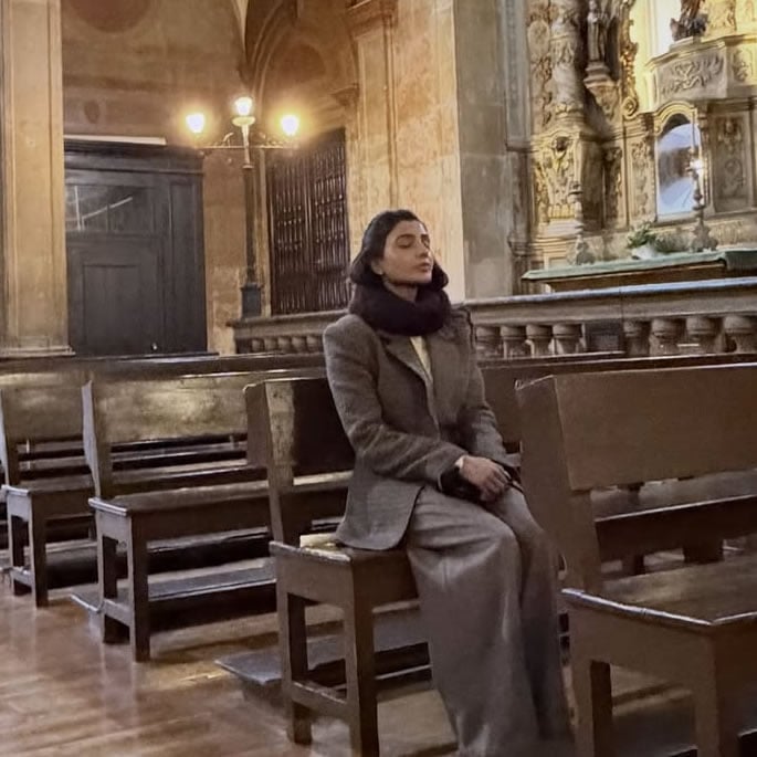 Other images show Samantha sitting inside a church and standing with her back to the camera while gazing down a scenic road.