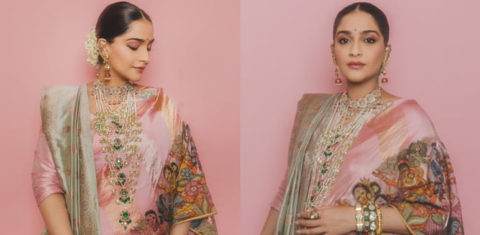 Sonam Kapoor accessorised with layered pearl strands accented by green emeralds, alongside a vintage pastel green choker that enhanced the delicate saree’s understated colour palette.