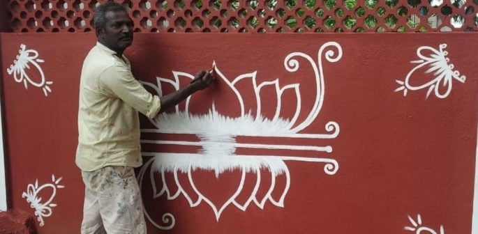 An Indian couple has helped a struggling Tamil artist by having him paint the wall of their home with traditional kolams and rangolis.