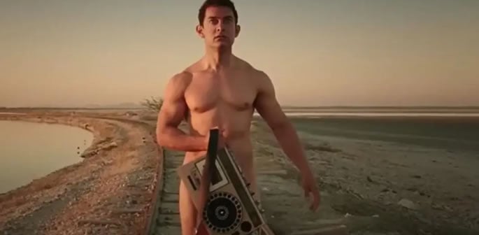 The opening scene features the titular character running naked and holding a radio to cover his modesty.